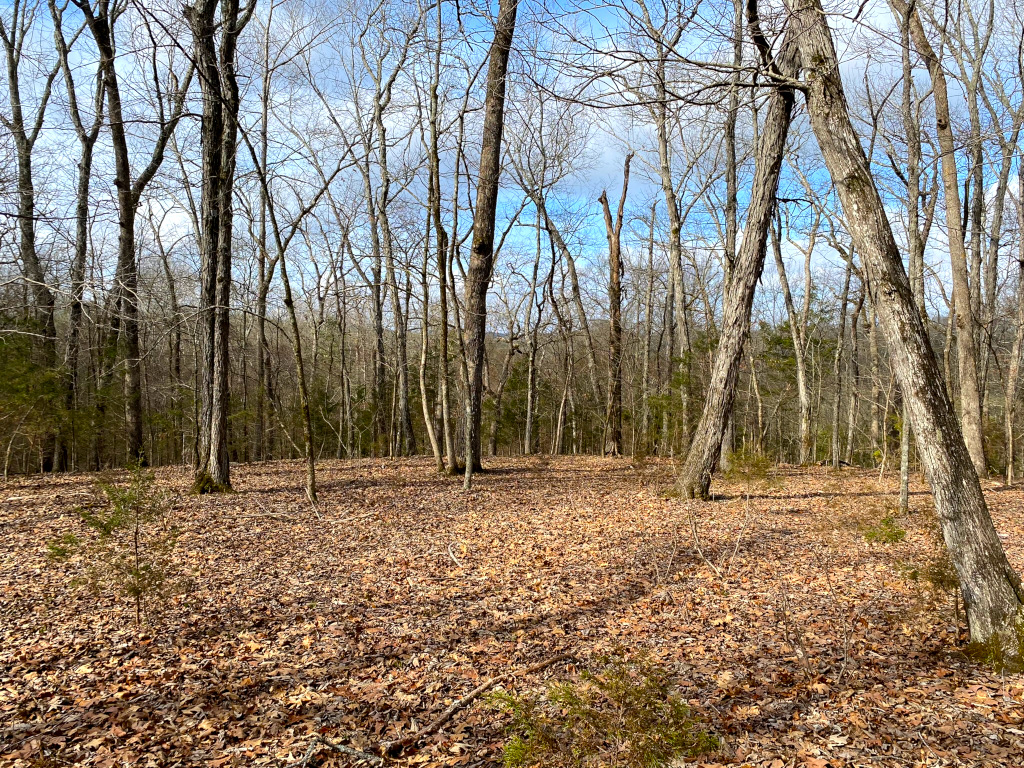 The creek is downhill from the house and the land drops on a steady incline. The trees in the woods consist mainly of pine, oak, cedar, sycamore and hickory. I know of only one dogwood and it is a puny one.